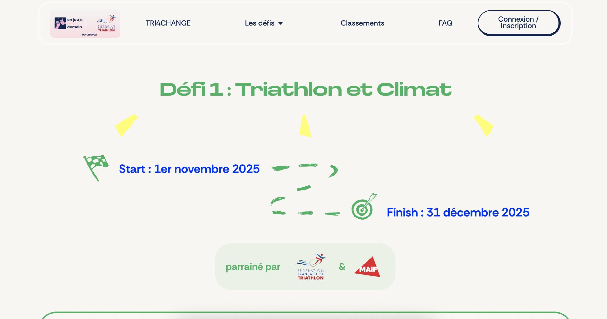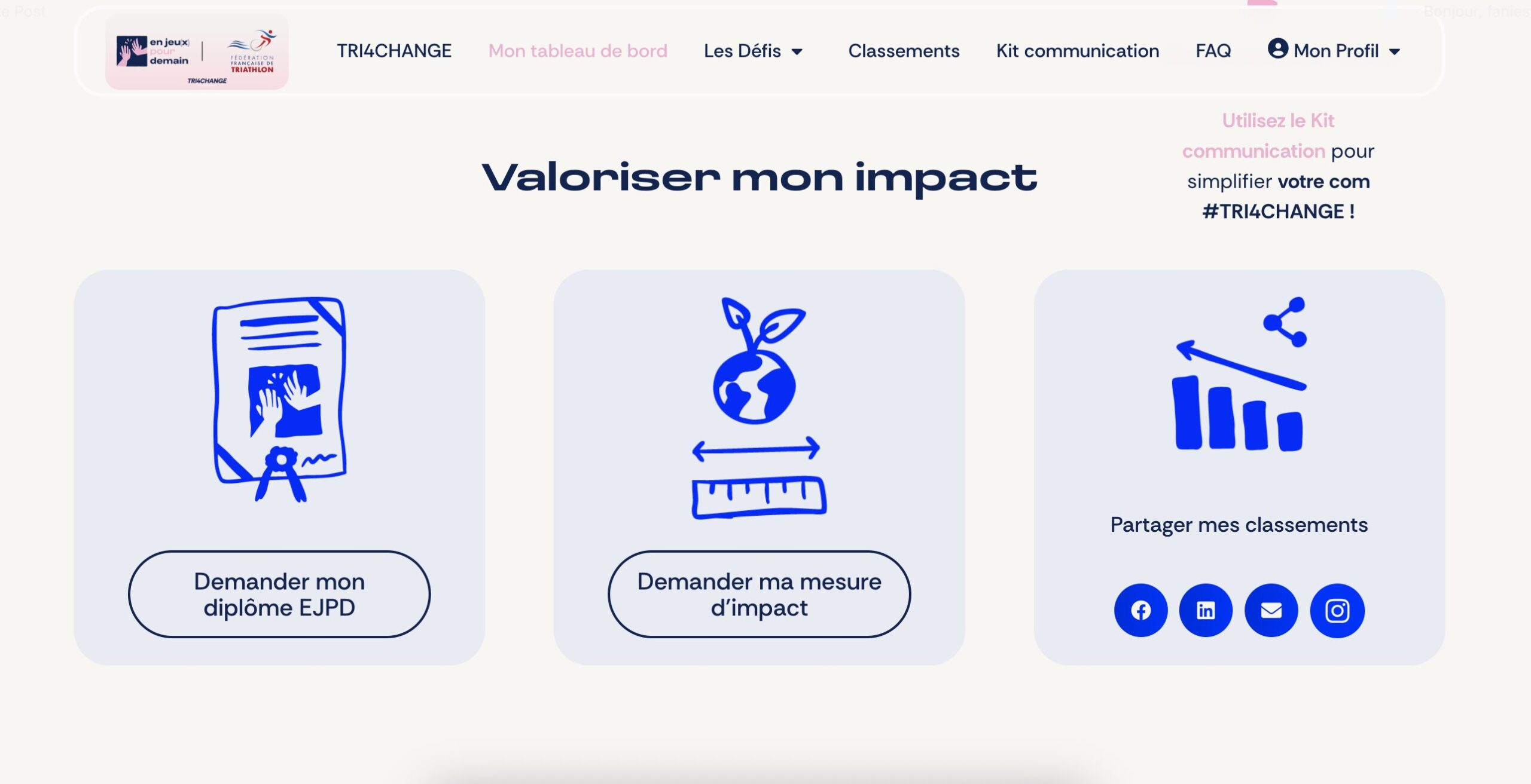 Par la suite, le site vitrine a évolué vers une plateforme digitale intégrant des fonctionnalités de connexion et d’inscription, un dashboard utilisateur, ainsi que la visualisation et le suivi des points pour chaque challenge : https://enjeuxpourdemain.fr/tri4change/